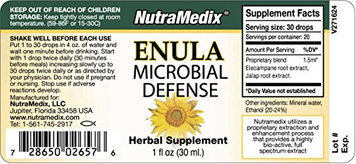 -. Binding : Health and Beauty -. Brand : Nutramedix -. EAN : 0728650026576 -. Feature : MICROBIAL DEFENSE - A proP.R.Ietary blend extracted from the Elecampane and Jalap roots, which may have microbial defense properties.* / PROP.R.IETARY WHOLE HERB EXTRACTION PROCESS - Highly bioavailable liquid for improved absorption. NutraMedix's unique enhancement process optimizes the whole herb for a more powerful broad-spectrum extract.* / FROM NATURE - Our products are sourced from nature's richest botanical resources, P.R.Imarily Peru and the Amazon Rainforest.* / FEEL THE DIFFERENCE - Put 1 to 30 drops in 4 oz. of water and wait one minute before drinking. Start with 1 drop twice daily (30 min. before meals) increasing slowly up to 30 drops twice daily or as directed by your physician. Do not use if pregnant or nursing. Shake well before each use. / OVER 20 YEARS OF NUTRACEUTICAL INNOVATION - Founded in 1993, NutraMedix supplies highly bioavailable nutritional supplements to health care professionals and consumers.* A majority of NutraMedix profits are donated to charitable organizations. -. IsAdultProduct : 0 -. Label : NutraMedix -. LegalDisclaimer : Product may not be exactly as shown. Please refer to product description for details. -. Manufacturer : NutraMedix -. MPN : 2657 -. PackageQuantity : 1 -. PartNumber : 2657 -. ProductGroup : Health and Beauty -. ProductTypeName : HEALTH_PERSONAL_CARE -. Publisher : NutraMedix -. Size : 30 mililiters -. Studio : NutraMedix -. Title : NutraMedix - Enula Microbial Defense, 1 Ounce -. UPC : 728650026576