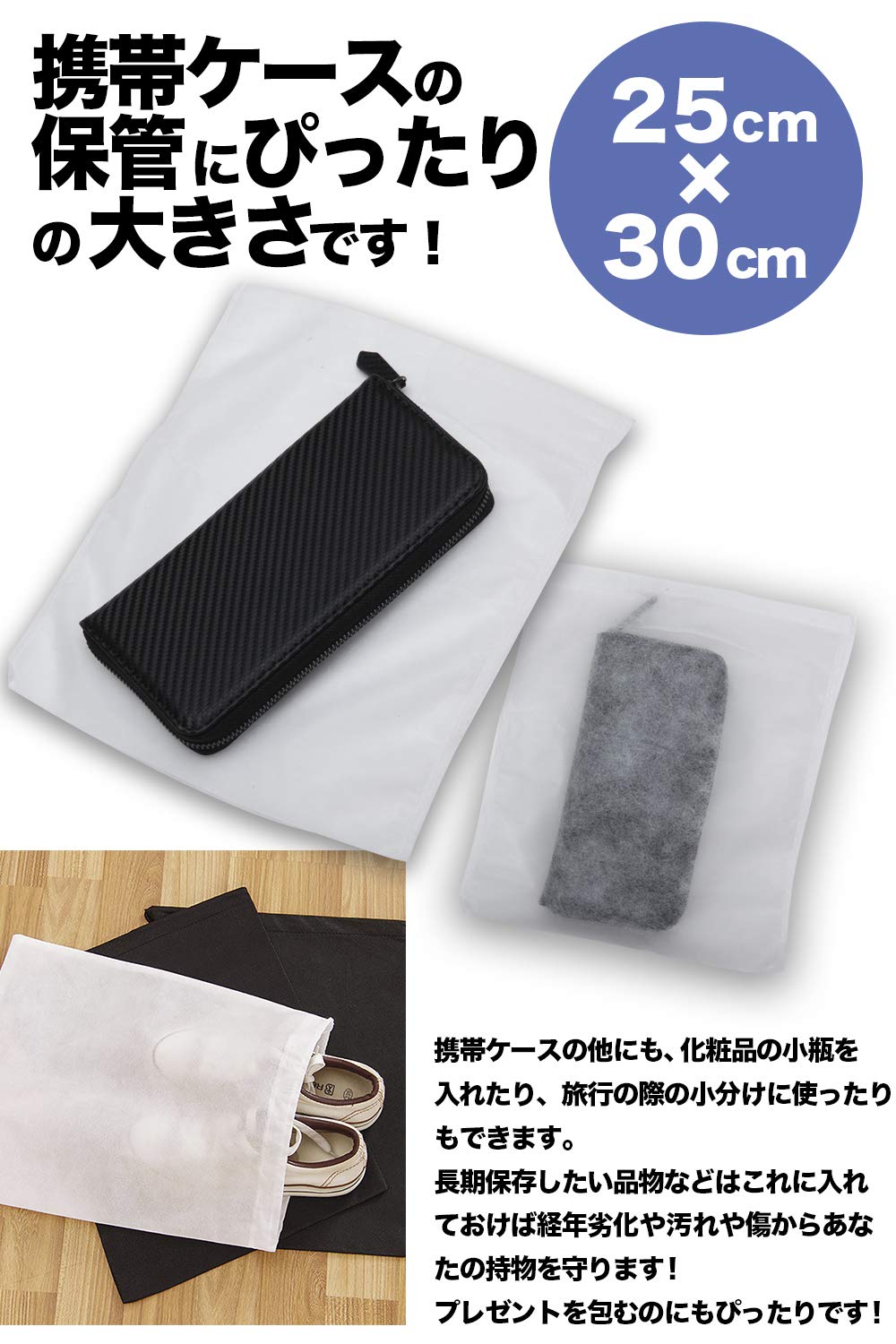 【サイズ】開口250(±10)mm × 深さ300(+0/-30) 【入れ数】100枚入り 旅行の際の洋服の仕分け袋として、ギフト、贈り物のラッピング用としてもどうぞ。 通気性が良く、しなやかな風合いの不織布で作られた収納袋。旅行、家庭生活で役立つ製品です。 大切な財布、小物バッグ、小物衣類などの保管に便利な不織布袋です。