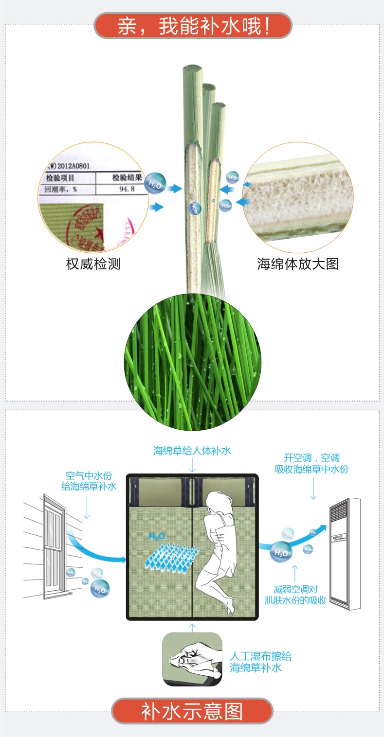 | 产品特点 | 1、白麻筋席面采用传统本草,从外观上看,每根草直径比一般蔺草粗,海绵体丰满,有韧性。 2、它能吸水,锁水,从而给肌肤补水,回潮率达14.9%。 | |||