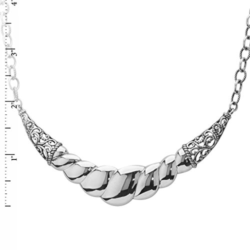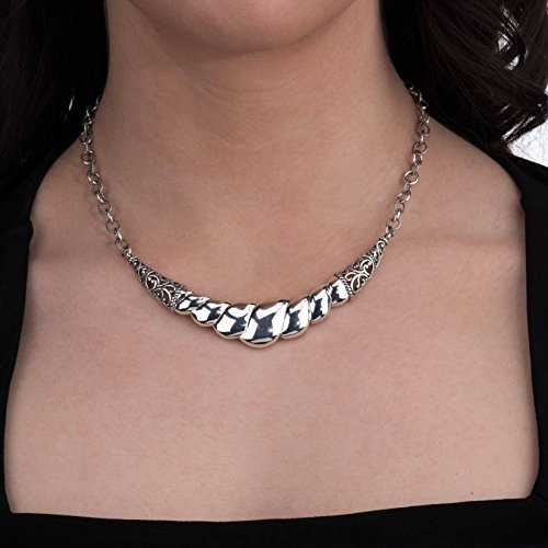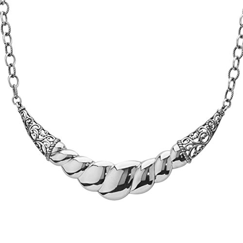 This necklace is truly a lovely presence on your neckline and sure to make a statement. Sterling silver signature scrolls and rope detail sweep down into a v shaped twisted sterling plaque. A sophisticated beauty that may be worn day or night.