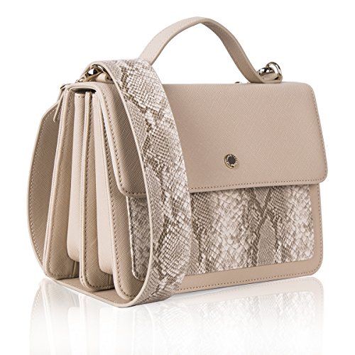 Small accordiant bag with top handle and detachable crosshatch strap. Bag with front open wall pocket and magnetic closure.