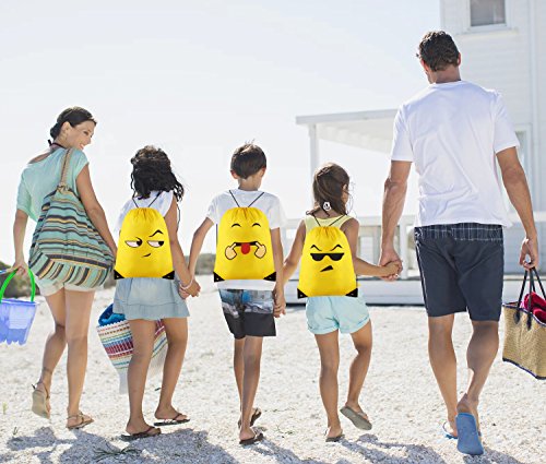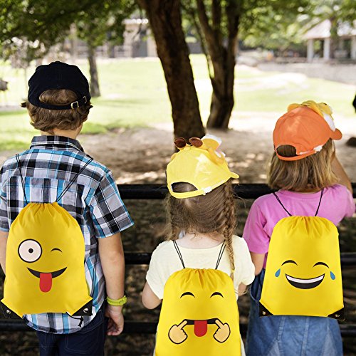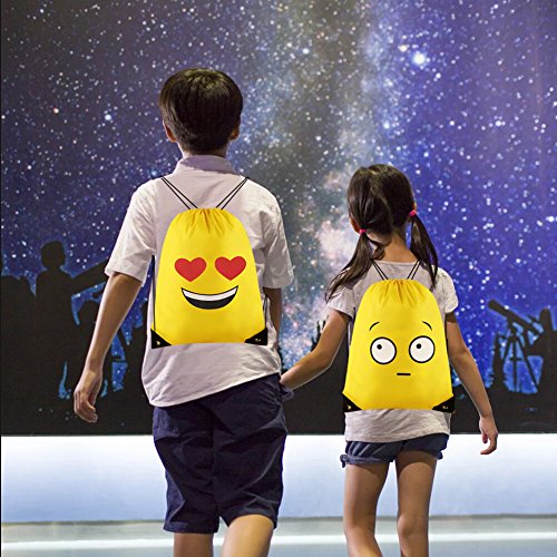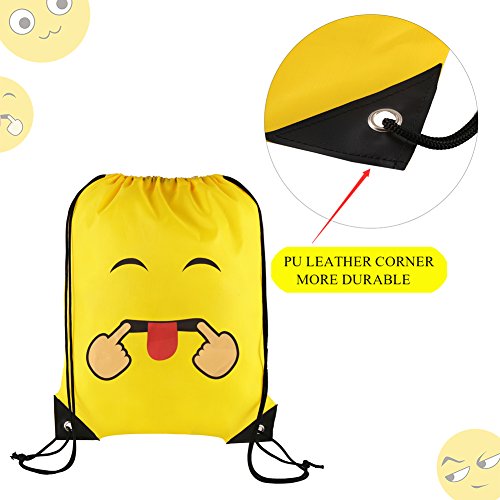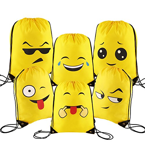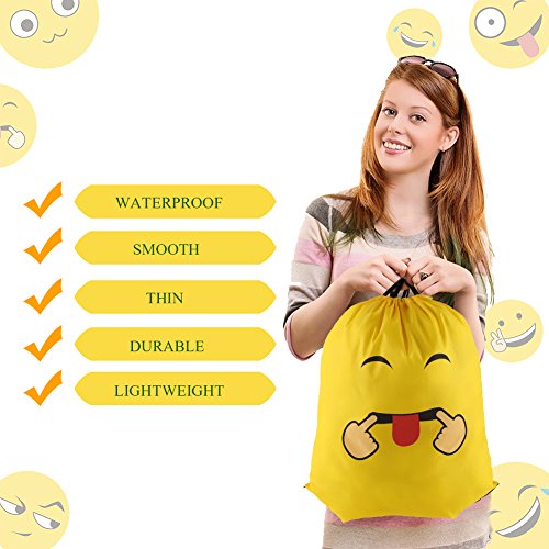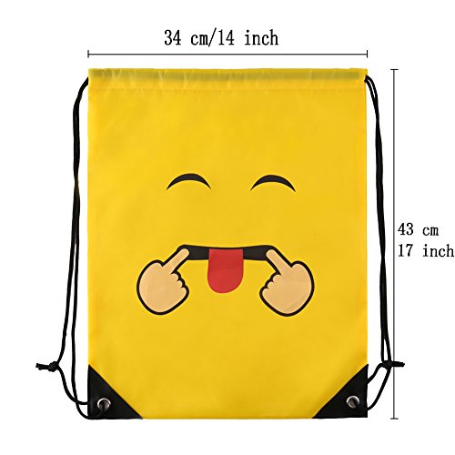 -. Feature : Package:12 pcs are included per pack in 12 different emotions.Per piece is 14x17 inches. / Material:Our emoji drawstring backpacks are made of high quality dacron,a kind of material similar to umbrella,waterproof ,smooth,thin but durable enough. / Perfect for:Our items are suitable for emoji theme birthday party, vacation bible school group,outdoor activities,goodie bags, party favor bags,overnight trips,Trick-or-Treat Bag.That is you can give out cute bags as gifts to all of kids or using it for carrying some daily items,such as water bottle, towel,snacks,pencil cases,toys, sneaker and snacks or other school supplies. / High quality:No awful smell,if you are completist or care the natural material smell you can put them outside to air out. They were absolutely perfect, well vivid P.R.Inted and pretty good for carrying light things. / Item details:The yellow emoji backpack is shaped with adjustable drawstrings and two holes for the string to attach to;the P.R.Inted emotion image is clear,colorfast and for long reusable using.The drawstring is extremely firm and convenient for you to adjust.