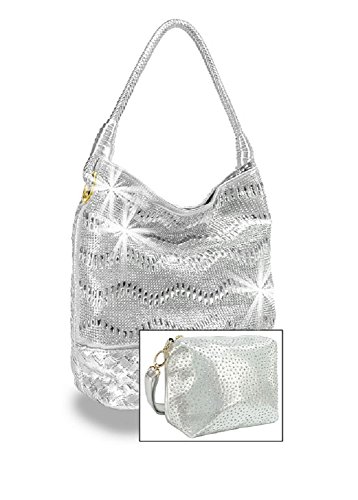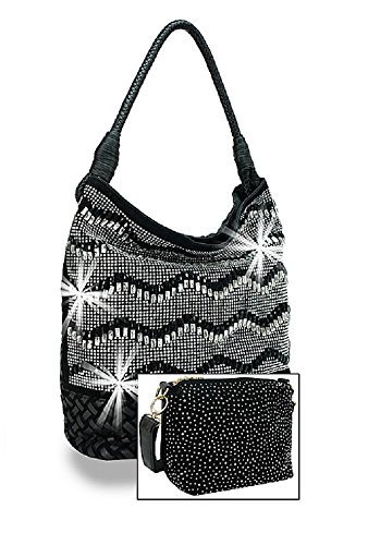 Product Description The top of the front panel is covered in a flowing chevron design created with tiny rhinestones and colored and clear rectangular, faceted gems. The body is a weave of metallic leatherette. Also included is a smaller zippered bag (10L x 7H x 4.5W) with its own shoulder strap. The main purse features a single carrying strap with an approx. 13" drop length, a zippered top opening, fully lined interior includes inside zippered pocket and cell phone pouch and measures approx. 13L x 13H x 5.5W. 0