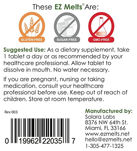 EZ Melts® are a full line of fast melting dietary supplements that are specially formulated to melt in the mouth quickly without the need for water. They are perfect for those who dislike swallowing pills or are prevented from doing so for medical or lifestyle reasons, or simply for those who want the benefits of quality, great tasting supplements. Advantages of EZ Melts®: Tablets melt rapidly in the mouth with a smooth feel - no need for water or swallowing large pills. Active ingredients become readily available for absorption before entering the digestive tract. Great tasting formulas featuring popular ingredients across the spectrum of health categories. We uphold the highest standards of regulatory compliance to ensure that our products are manufactured with safety, integrity and in accordance with the current Good Manufacturing Practices (cGMPs). We are an FDA-registered, USDA-approved facility and have been audited by regulatory authorities.Feature