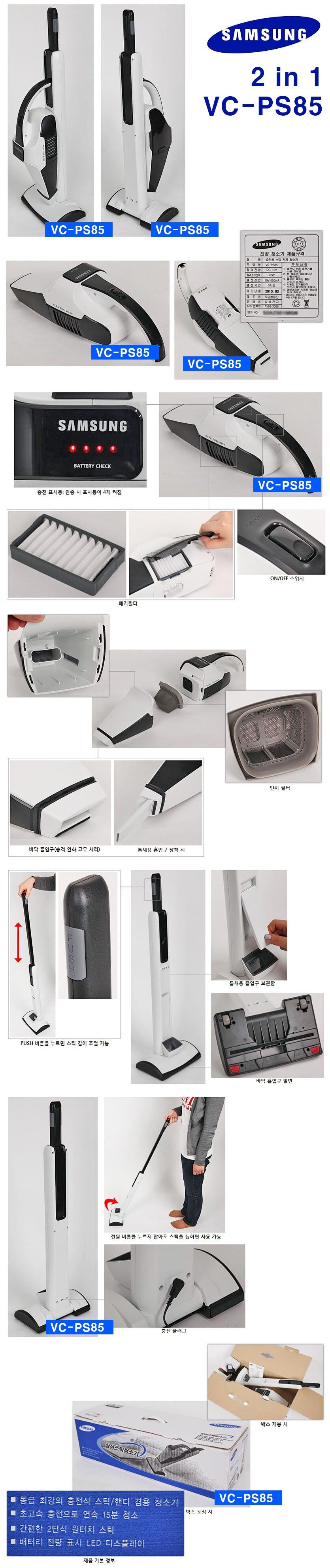 Products Model : SAMSUNG VC-PS85 Power : 220V/60Hz Charging time : 5 hours Operating time : 15mins Color : White & black Size : 119 x 121 x 410 mm Weight : 1.28kg
