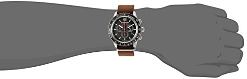 Wenger 01.0853.106 Roadster Black Night chronograph men's watch features a 45mm wide and 12mm thick solid stainless steel case with a unidirectional rotating black accented bezel and textured push-pull crown with function pushers. Wenger 01.0853.106 is powered by Swiss Made Ronda 5030.D quartz chronograph movement. This stylish watch also features a textured black dial with white accents black luminous hands and index hour markers along with the chronograph and date display functions, scratch resistant sapphire coated mineral crystal and water resistant to 100 meters. Wenger 01.0853.106 is equipped with a 22mm wide brown leather strap with a buckle clasp. Wenger 01.0853.106 men's Roadster Black Night black dial brown leather strap chronograph watch is brand new and comes in an original Wenger gift box and is backed by a 3 years limited warranty.Feature