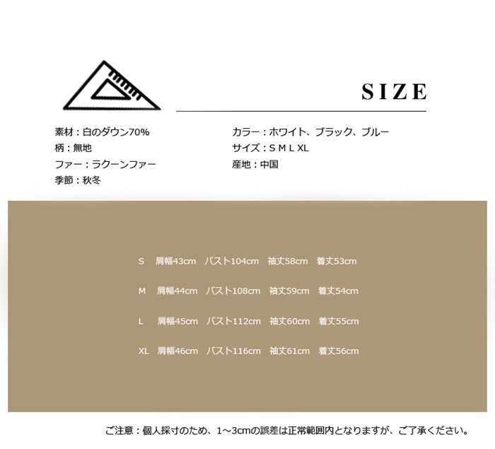 ダウンコート レディース ダウンコート ショート丈 軽い ダウンジャケット 大きいサイズ レディース 上品 2018秋冬新作 ダウンコート レディース ショート ダウンジャケット 大きめ商品詳細素材:白のダウン70%柄:無地ファー:ラクーンファー季節:秋冬カラー:ホワイト、ブラック、ブルーサイズ:S M L XL産地:中国サイズ参照表S 肩幅43cm バスト104cm 袖丈58cm 着丈53cmM 肩幅44cm バスト108cm 袖丈59cm 着丈54cmL 肩幅45cm バスト112cm 袖丈60cm 着丈55cmXL 肩幅46cm バスト116cm 袖丈61cm 着丈56cmご注意:個人採寸のため、1~3cmの誤差は正常範囲内となりますが、ご了承ください。ダウンコート レディース ダウンコート ショート丈 軽い ダウンジャケット 大きいサイズ レディース 上品 2018秋冬新作 ダウンコート レディース ショート ダウンジャケット 大きめ