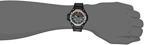The Casio Men's Multi-Task Gear Sports Watch brings you a range of information in multiple formats. Accented with screw details in the corners, the contoured resin case frames a round, black dial with an outside minute track, luminous hand and hour markers, and three sub-dials at the bottom of the dial. Featuring five alarms, a countdown timer, stopwatch, 12- and 24-hour formats, and a velocity indicator, this high-performance timepiece is Water resistant to 100 m (330 ft): In general, suitable for swimming and snorkeling, but not scuba diving. (100 meters). An LED light makes it easy to read in any light conditions, and this sleek watch secures to the wrist with a flexible resin band. You'll love the feel of this slim watch, which adds comfort and style to its superior functionality.Feature