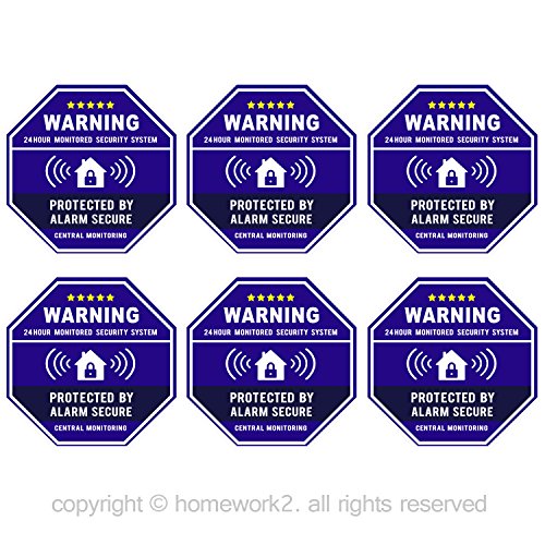 -. Feature : 6 of Authentic Home Security Stickers "Outside" Door & Window Stickers / Material : Vinyl , Back Self Adhesive / Blue and White in Color, Each label size 3.3 X 3.3 Inch, Octagon-Shaped / Easy to Apply; Peel-n-Stick; Adhesive on Back; UV Protect & Waterproof / 2 Year "No-Fade" Warranty Only at HOMEWORK2