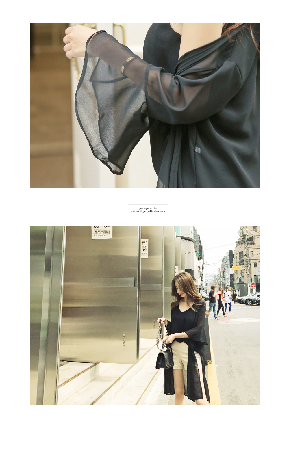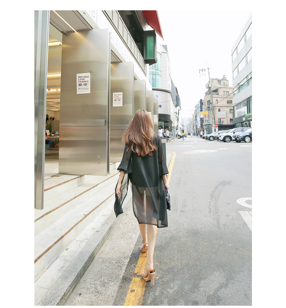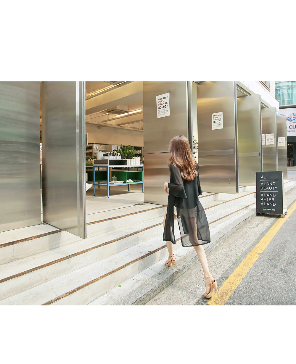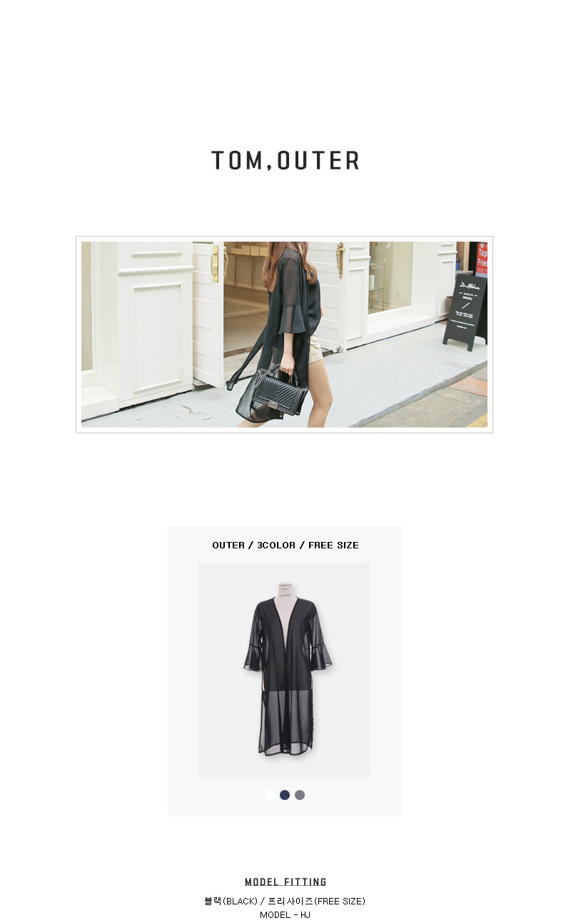 7부 기장으로 떨어지는 프릴소매와 일자로 딱 떨어지는 핏감으로