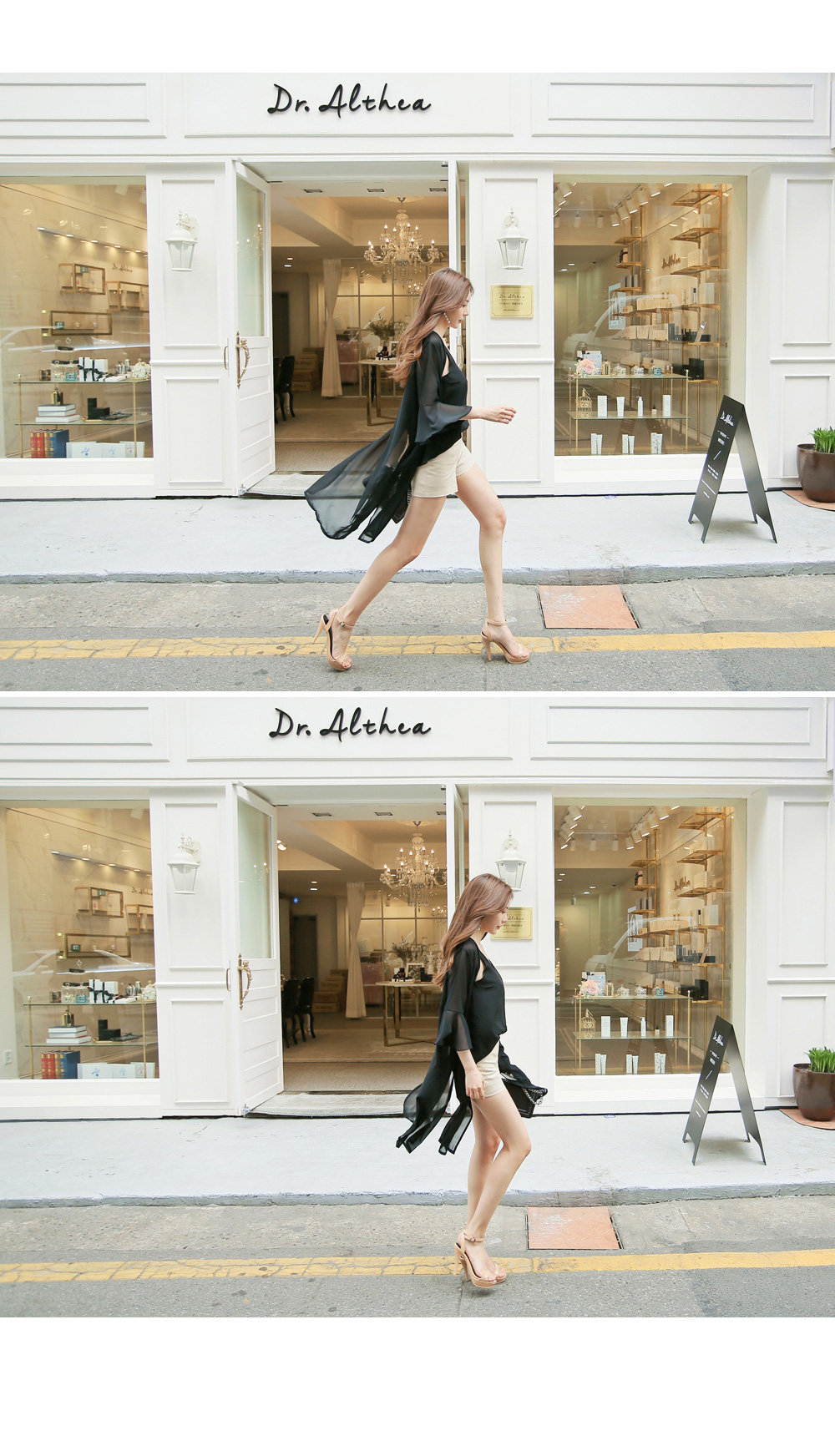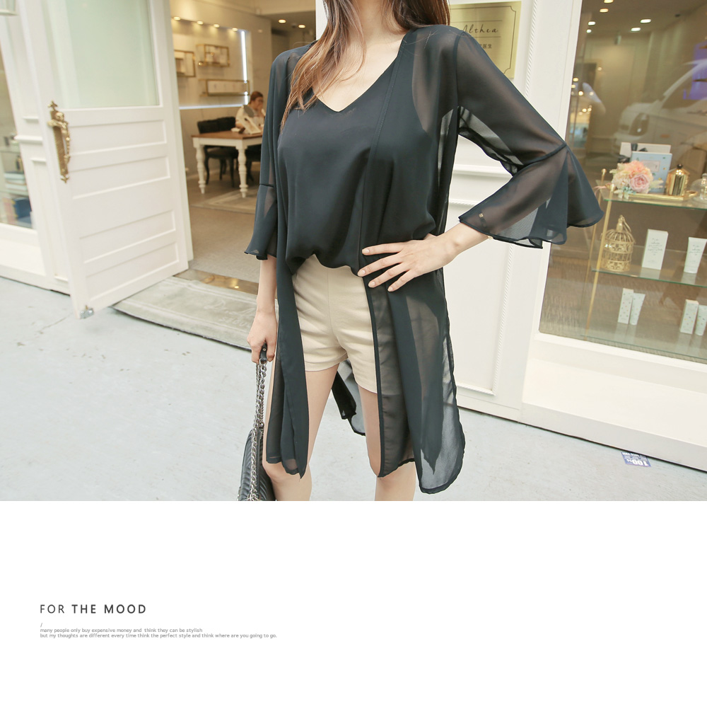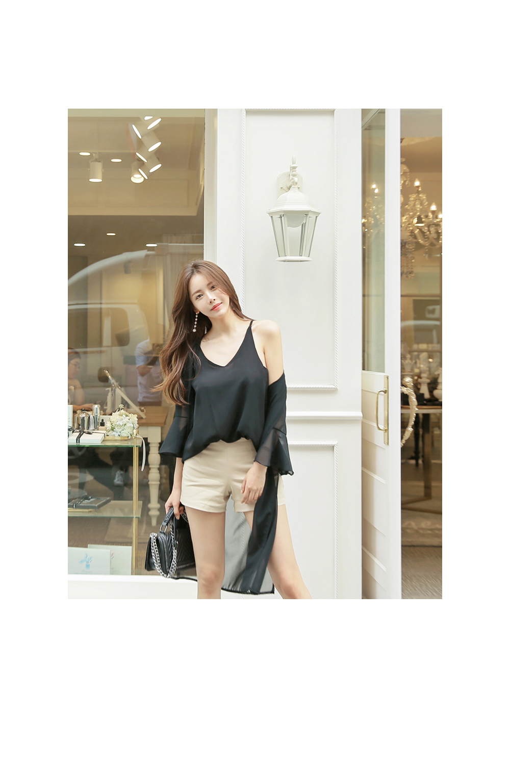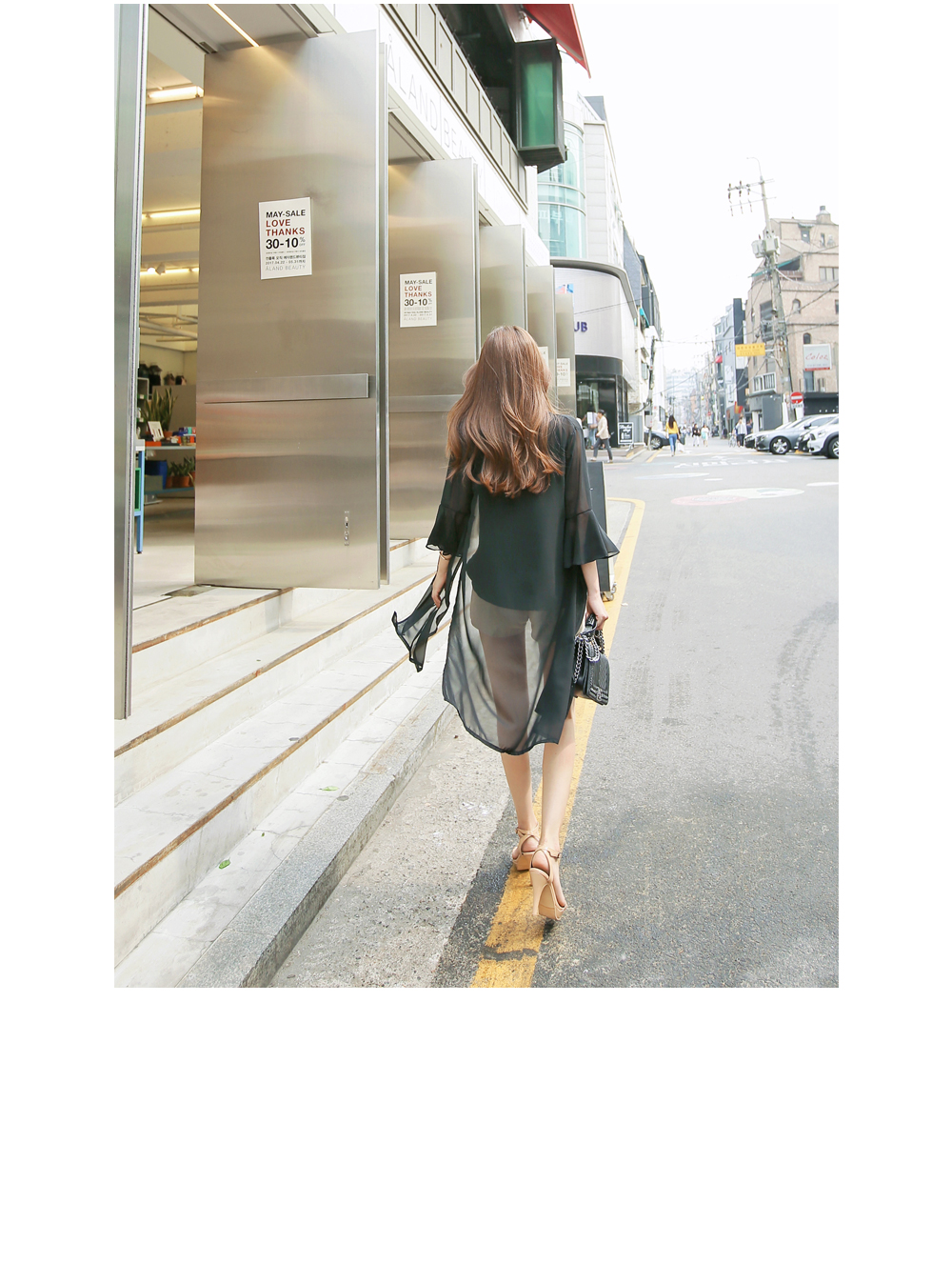 7부 기장으로 떨어지는 프릴소매와 일자로 딱 떨어지는 핏감으로