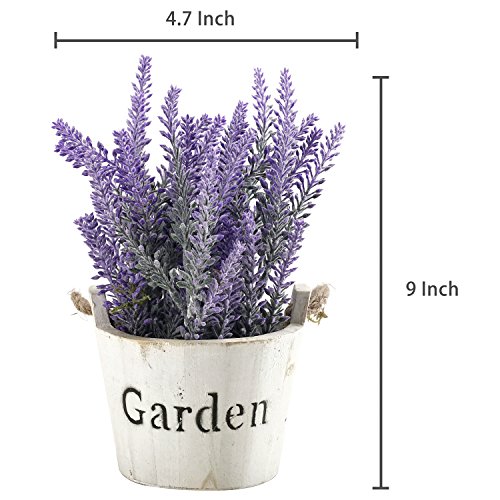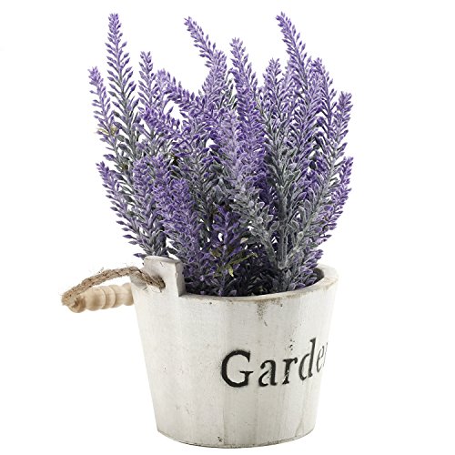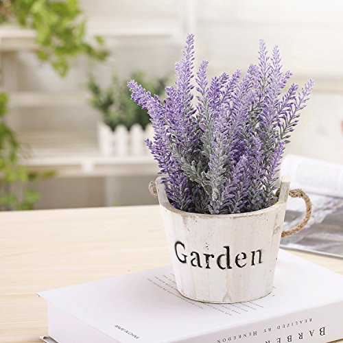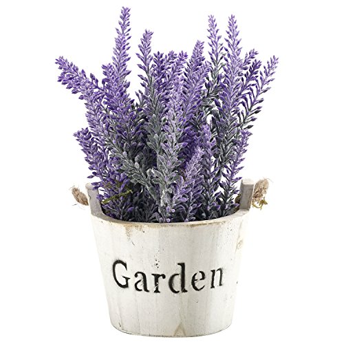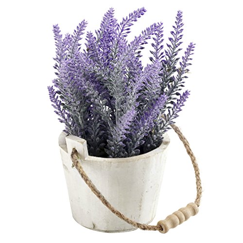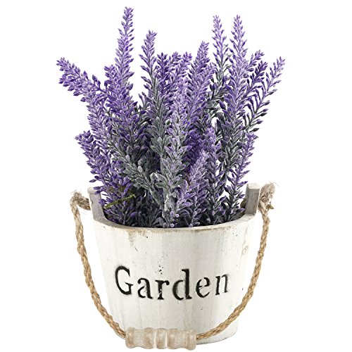 Artificial Lavender in Vintage Style Whitewashed Wood Stave GARDEN Bucket with Rope Handle