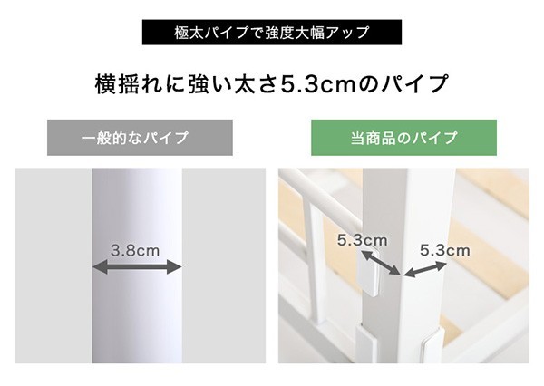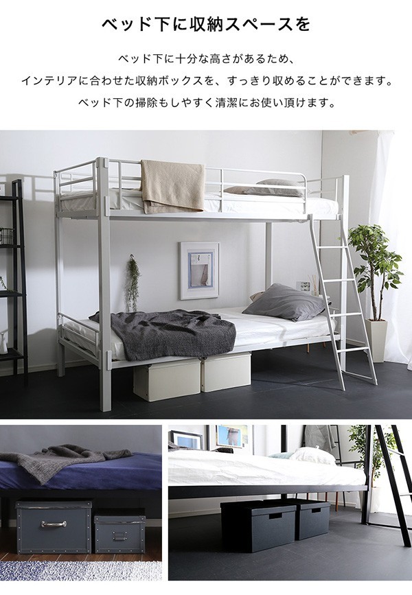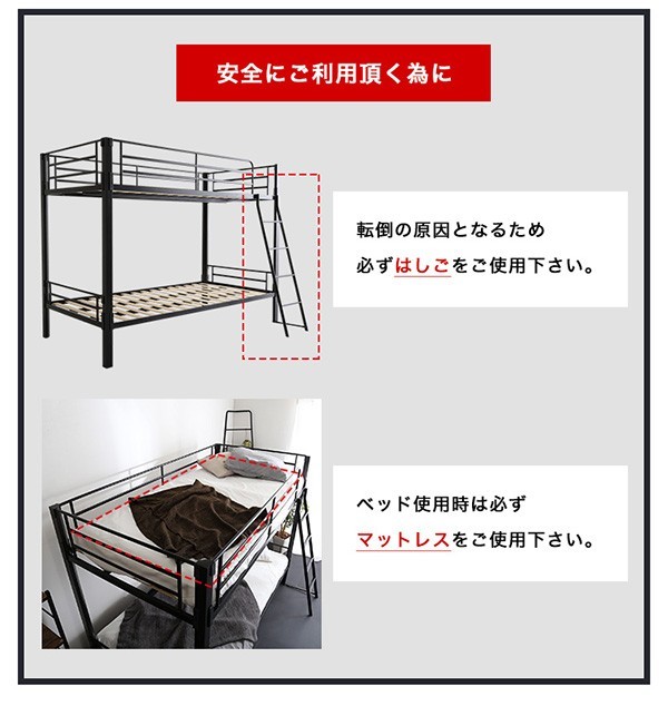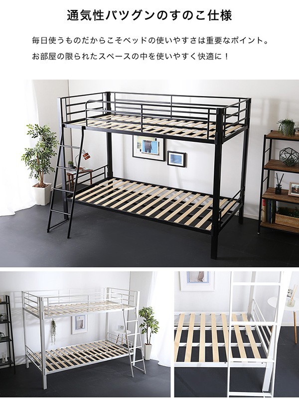 【商品について】ボルトレスベッド(シングル)2段【Shaft-シャフト-】 ボルトレス 天然木 パイプ スノコベッド すのこ シングル 簡単 工具不要 2段ベッド 二段■サイズ:(約)幅205x奥行102x高さ151cm※商品重量:(約)42.2kg■カラー:ホワイト ブラック■素材:本体:スチールすのこ部分:合板(LVL)■その他:・お客様組立商品です・梱包サイズ:(2-1)203.x41.5x10.5cm(2-2)106.5x38x18cm梱包重量:(約)44.2kg
