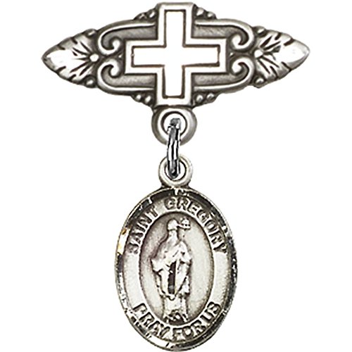 -. Title : Sterling Silver Baby Badge with St. Gregory the Great Charm and Badge Pin with Cross 1 X 3/4 inches