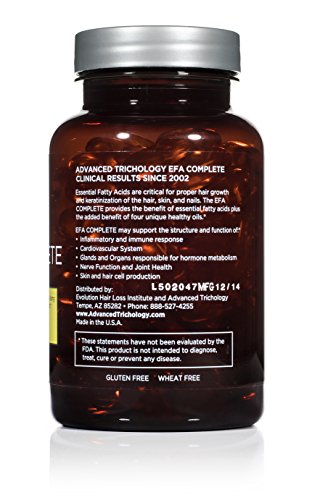 -. Feature : EFA COMPLETE offers the optimal benefits of High Potency Flax Oil, Fish Oil, Borage Oil, and Evening P.R.Imrose Oil. / Essential Fatty Acids in the EFA COMPLETE promote Healthy Hair, Skin, and Nails along with Cardiovascular and Joint Health* Overall Daily Wellness Evening P.R.Imrose Oil-Borage Oil-Flaxseed Oil-Fish Oil / OMEGA 369 should be added to any Hair Growth Treatment Regimen / CONTAINS: Evening P.R.Imrose Oil 600 mg, Borage Oil 600 mg, Organic Flaxseed Oil 600 mg, Marine Lipid Concentrate 600 mg per serving / QUALITY GUARANTEED: Clinically Tested and Proven Effective by Evolution Hair Loss Institute. Manufactured in a GMPc and FDA Approved Facility. EFA COMPLETE is GLUTEN, Free, and WHEAT Free.