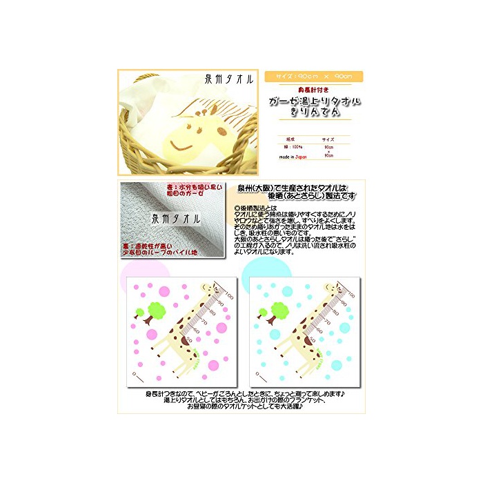 원본상품명: 身長計バスタオル 裏ガ?ゼ キリン柄 90cm×90cm S709 日本製