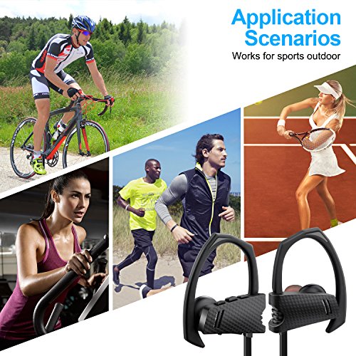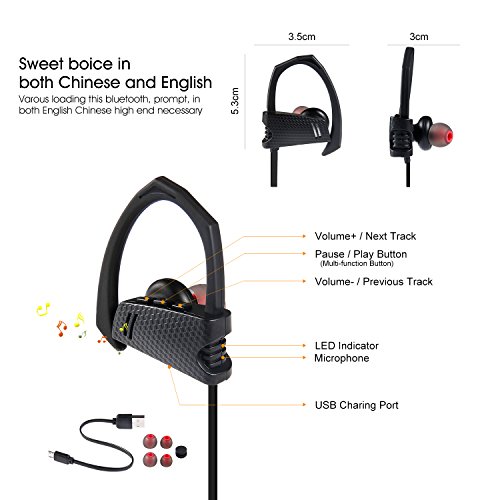 -. Feature : 1.BLUETOOTH 4.1 AND SUPPORT 2 DEVICES CONNECTION: With bluetooth 4.1 and apt-X tech, easy and fast pairing with smartphones, the headphones ensure high-fidelity stereo music and clear speech within 10 meters.Supports connect two bluetooth devices at same time. / 2.LONG-LASTING USAGE: Up to 6 hours talk time / music time (Playtime varies according to volume level and audio content). It also has up to 150 hours of standby time and charges in 1-2 hours (ATTENTION: when charging using a USB adapter, the charging current is not greater than 1A). / 3.LIGHTWEIGHT COMFORTABLE: Ultra light design-18g, enjoy a lightweight construction ergonomic and flexible In-ear design, soft smooth silicone gel surface have comfortable wearing without falling out so the headphones stay put while running, biking or at the gym. / 4.NOISE ISlOAITING AND TOP QUALITY AUDIO: CVC 6.0 noise Isolation technology reduces outside noises, So you can enjoy your favorite music,no matter where you are. And the integrated microphone lets you chat without noise or other interference. / 5.IPX5 WATER RESISTANT: Bluetooth headphones chip with internal nano-coating treatment and water resistant shell offer a double layer of water resistant protection. Can run in the rain or sweatproof in the gym to enjoy the music or phone communication.