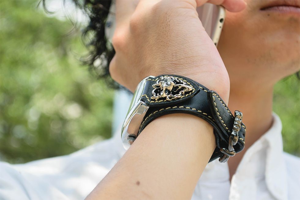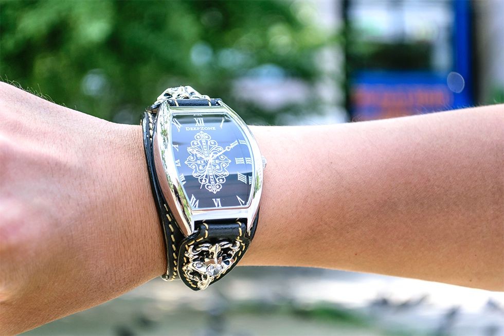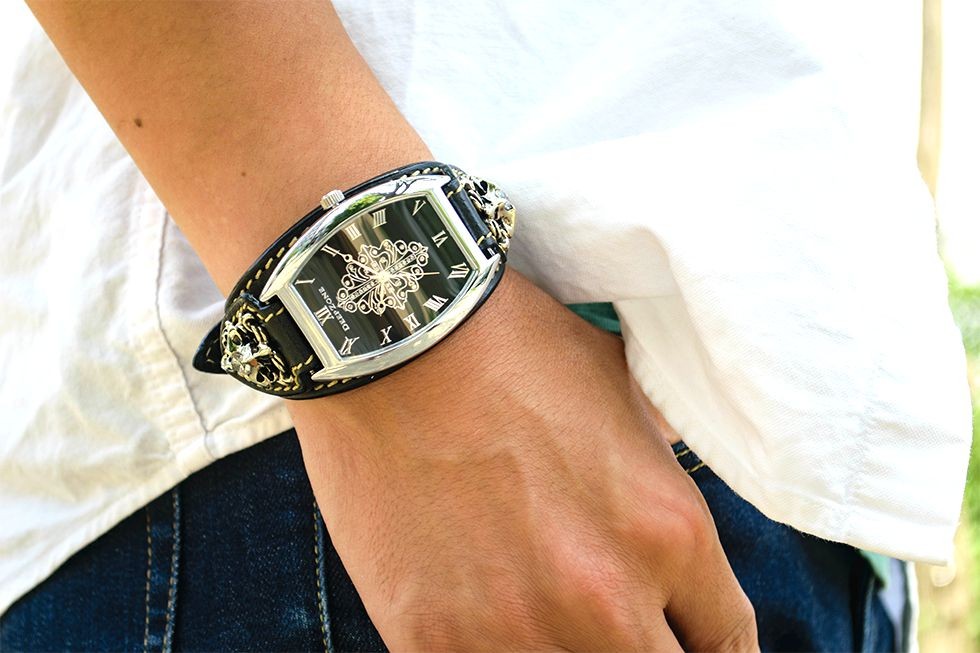 神秘的なジルコニアクロスフェイスのムーヴメント。贅沢に使用したイタリアンレザーのブレスベルト。レアなホワイトメタルで作られたクロスコンチョ。ビジネスにカジュアルに愛用できるブレスウォッチは上品で飽きのこないフォルム!◆ ケースサイズ:H53mm W38mm D11mm◆ 有効着用サイズ:約16cm~19cm◆ 素材  →ベルト:牛革(イタリアンレザー)  →コンチョ:ホワイトメタル  →バックル:合金  →ケース:ステンレス◆ 特徴  ・国産ムーブメント仕様  ・日常生活防水  ・保証書付  ・専用ケース付属