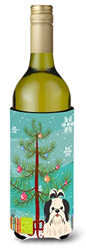 Caroline's Treasures BB4213LITERK Merry Christmas Tree Shih Tzu Black White Wine Bottle Beverage Insulator Hugger, 750ml, Multicolor