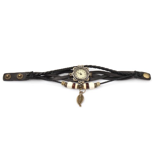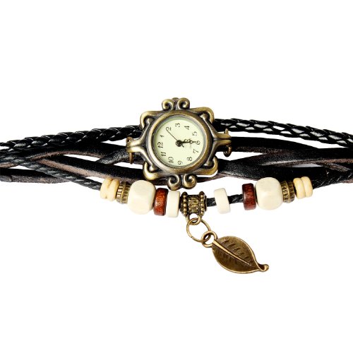 -. Title : Bohemian Style [Retro] Handmade Leather [Tree Leaf] Wrist Watch. Beautiful, Fashionable [Luxury] & Stylish [Weave Around] Wrap Watch Bracelet For Women, Ladies, Girls- Black