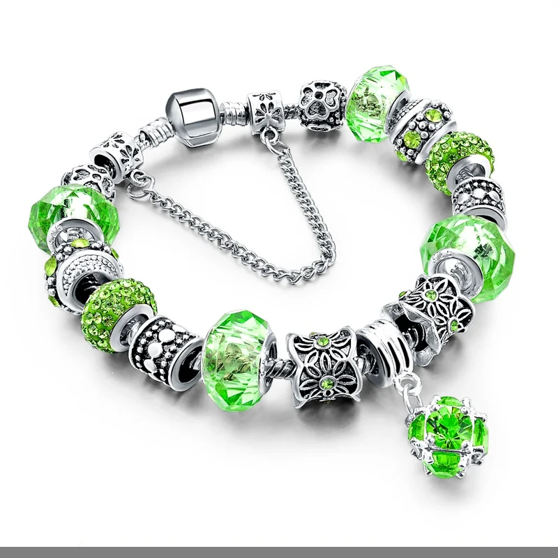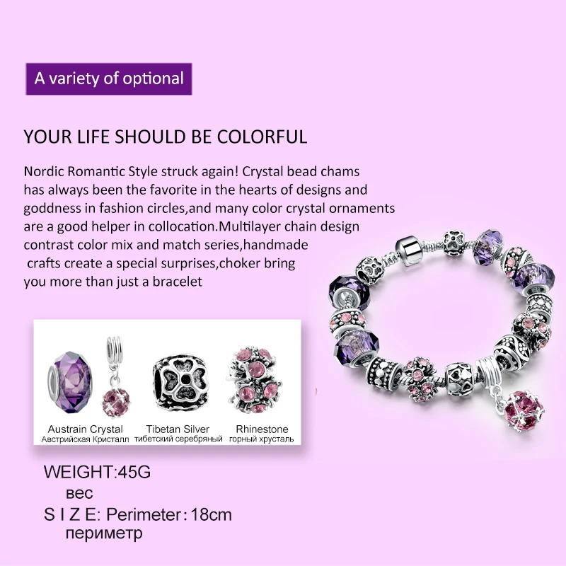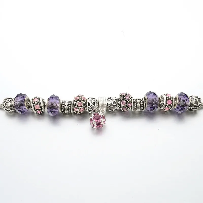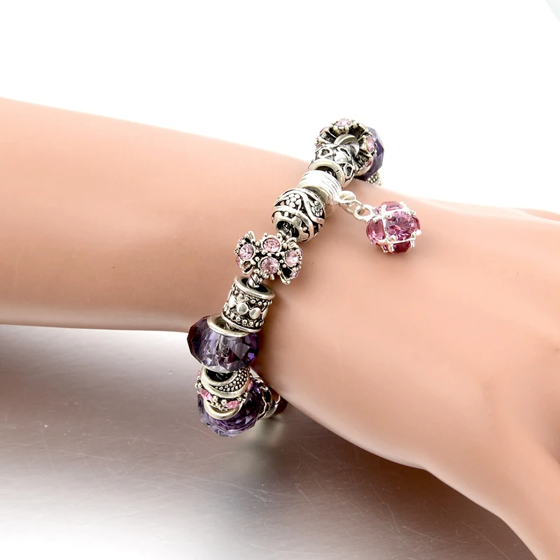 Metal:Silver color Crystal Charm Bracelets for Women With Purple Glass