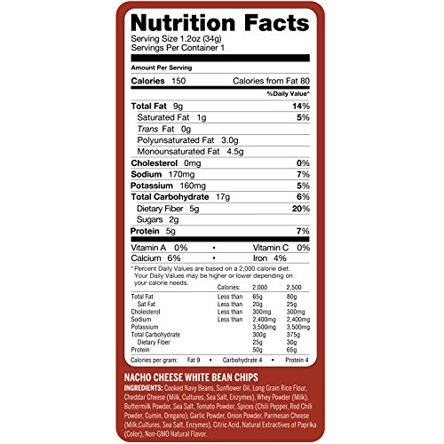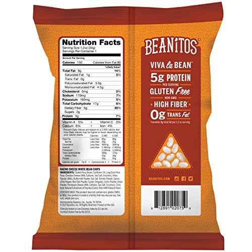 ReleaseDate : 2016-04-23 Studio : Beanitos Publisher : Beanitos Binding : Grocery Product Description Enjoy the bold taste of nacho without the guilt. Beanitos Nacho Cheese white bean chips pack the bold, cheesy flavor you crave without artificial ingredients. A wholesome bean chip without compromising on the flavor! Beanitos chips are packed with PROTEIN FIBER, always gluten free, non-GMO, corn free and taste incredible. The best part ? they’re made from wholesome beans! 0