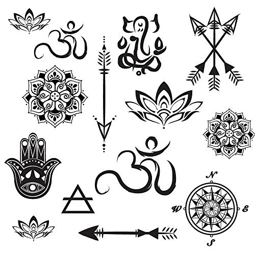 Yoga Mini Designs Temporary Tattoo Set - Mini Mandala, Lotus, Hamsa, Aum, Arrows, Compass - Yoga Gift Accessory - 28 Total Temporary Tattoos - Cut Apart...