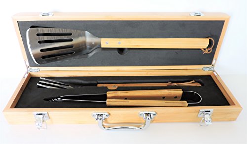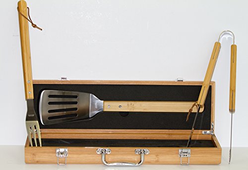 - Includes Stainless Steel Spatula, Tongs, & Grill Fork