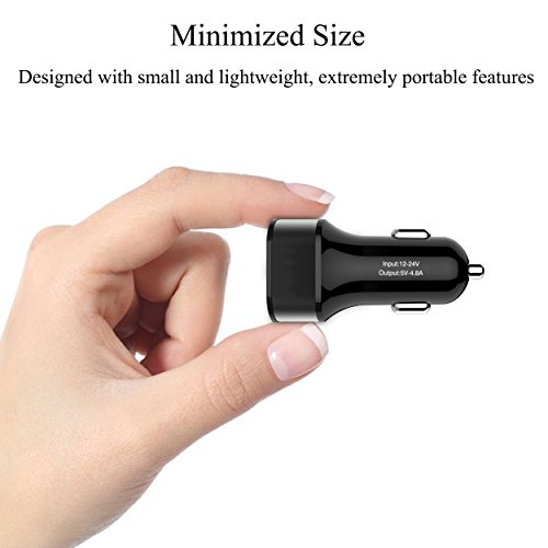 -. Feature : Dual USB Charging Ports- Dual smart USB ports quickly and easily identify your mobile devices, to provide optimal charging efficiency automatically, simultaneous charging any two devices at high speed with 4.8A total output power. / Safety Usability-This USB car charger has multiple built-in voltage regulators fully protecting your devices against over-current, over-charging and over-heating for safe and rapid charging, ensuring superior performance and reliability. / Practical Inner-Glowing - Featuring cool blue LED inner glowing from dual USB ports. The glowing ports are bright enough to helps locate ports in the darkness or at night without being distracting. It is also specially dimmed to avoid distracting you when driving in dark. / Compact & Portable - Compact design with small and lightweight features for added portability, easily fits in socket with limited space. / [12-Month Warranty]Universal Compatibility: Universal compatible with any Android and Apple mobile devices,including Apple iPhone X, 8/8 Plus, 7/7 Plus, 6/6s, 6/6s Plus, SE/5s/5/5c, Samsung Galaxy S7/S7 Edge/S6/S6Edge+/S6 active,S5/S4,Note 5/4/3, Nexus7/6/5/4,Nokia,HTC,Motorola,LG,SONY,and other smartphones and tablets, GPS units, iPods, MP3 players and more.