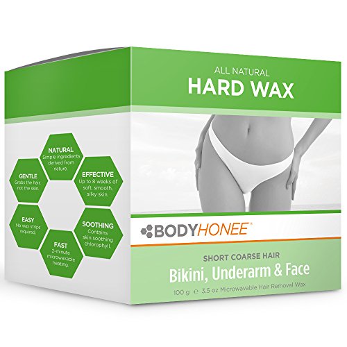 Hard Wax for Face, Underarms + Bikini: BodyHonee's All-Natural Hard Wax is designed for removal of short coarse hairs, specifically on the bikini area, underarm, and face. Our Hard Wax contains plant-based Chlorophyll, a natural anti-inflammatory that will instantly soothe and calm the skin. Our strip-free formula does not require a fabric strip for the waxing process, because the wax firms up as it cools and becomes the strip itself. For this reason, it is particularly well suited for short, coarse hair as it literally 'shrink-wraps' around each strand, grabbing hold of the most stubborn hairs to lift them out from the root, leaving you silky smooth for up to 8 weeks!Feature