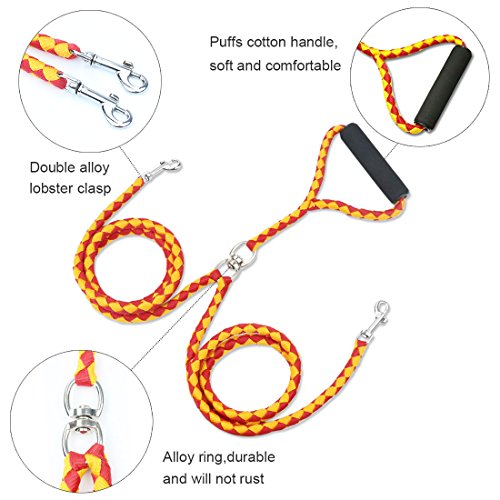 Studio : Idepet Publisher : Idepet Binding : Misc. Product Description Idepet Pet Double Dog Leash for 2 Dogs,No-tangle Dual Leash for Small ,Medium,Large Dpg,Dual Braided Leash Padded Handle for Walking and Training NO TANGLE DESIGN This swivel leash design solves the problem of tangled up dogs.It means 2 double leash doesn't tangle when they cross over each other.. SOFT HANDLE DESIGN Double leash with puffs cotton handle,soft and comfortable. Easy to hold on without any issues.Perfect to protect your hands. EASY CONTROL LENGTH The length of leash(140CM) is long enough to give them some space to wander but not so long that it will get wrapped around their legs.Suitable for small,medium and large dogs. USE EASILYTangle-free dog leash is easy to control the pulling without any extra effort needed when you walk/train/run with the dog. PACKAGE INCLUDED 1 x Double Dog Leash SPECIFICATION Material: Nylon Polyester Length: 140CM/55' Weight: 220g Color:Red-yellow 0