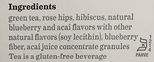 -. Feature : Green tea with natural blueberry flavors with other natural flavors (soy lecithin), wild blueberry and apple pieces / Individually, foil wrapped bags to preserve freshness / 25-50 mg of caffeine / Gluten free and kosher