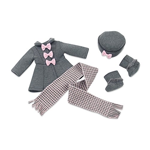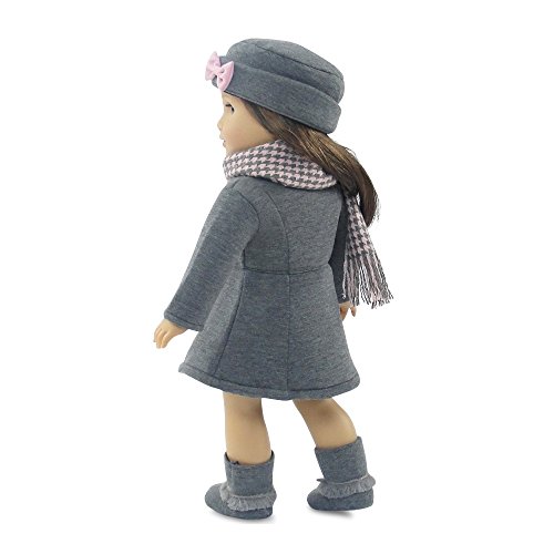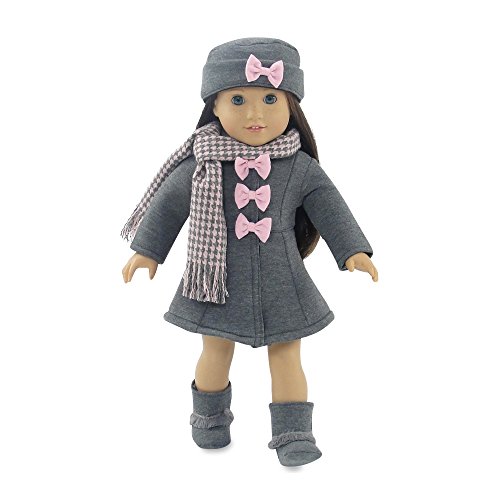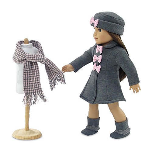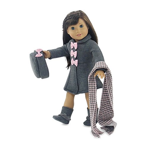 - Gorgeous doll outwear set also includes matching grey hat with pink bow, oh so cool grey boots and a beautiful grey and pink hounds tooth scarf!