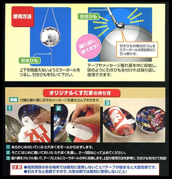 ミラーボールの中身がくすだまになっており、「祝おめでとう」の垂れ幕とたっぷりの5色のメタルテープが入っています。使用後は中身を元に戻して何度でも使用でき、メッセージを書き込める無地の垂れ幕付きなので、オリジナルのくすだまも作ることができます。くすだま本体は、ミラーボールとしても使用可能。照明を反射してキラキラ輝くので吊しておくだけでもパーティー気分に♪ |