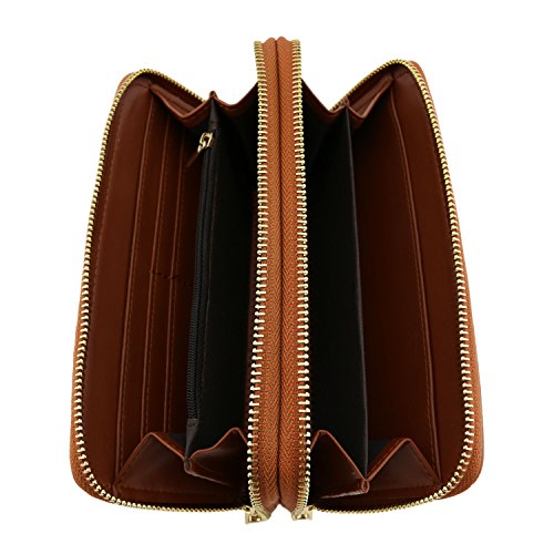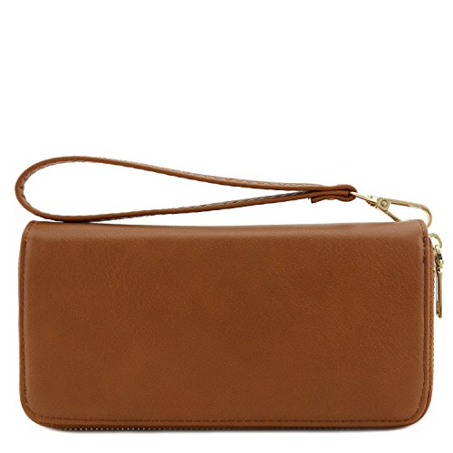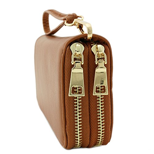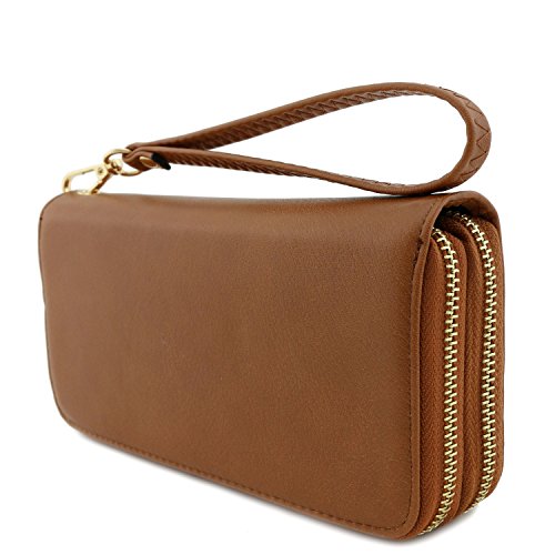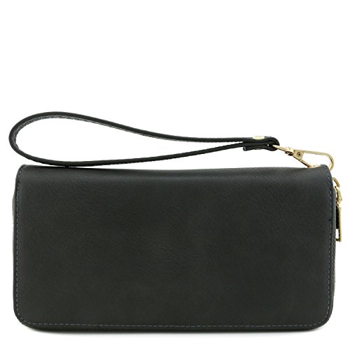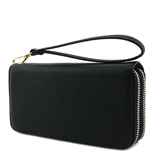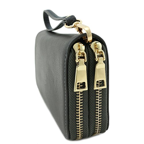 -. Feature : 7.75" (L) x 4" (H) x 1.75" (D) / Zipper closure / Faux leather & gold tone hardware / Detachable 8.5" wrist strap / 8 card slots, 4 bill slots & 1 zipper pocket inside