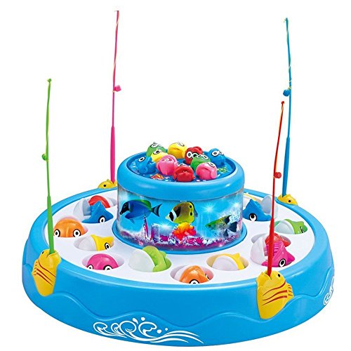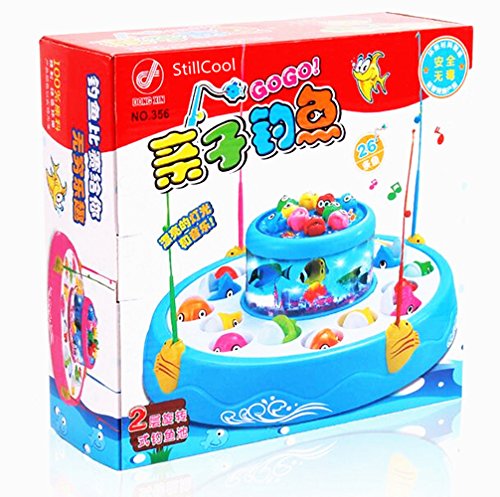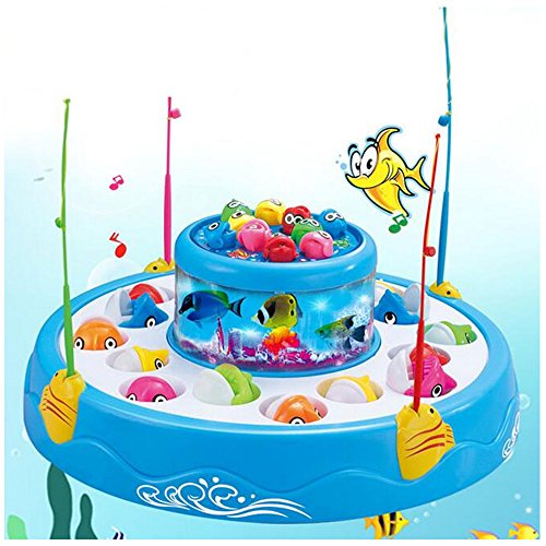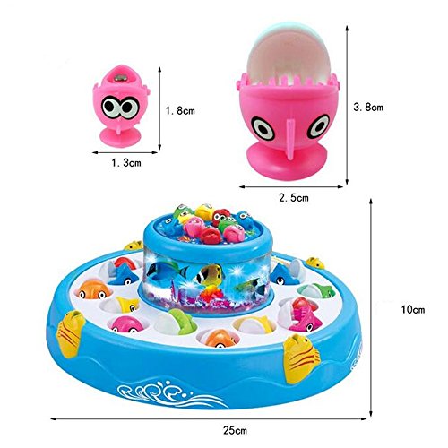 Product description The game is cute and easy, The set of fishing play game includes 4pcs magnetic fishing rods, 10pcs small magnetic fish, 16pcs large colorful fish and a 2-plate rotating game board, allowing up to 4 children to play together. When switch on, the fish plate will turn and accompany with music and light, the fish in it are always open and closed. The purpose is to catch as many fish as possible with the fishing rod that is delivered. Can help to improve your children, solidarity and competitive spirit
