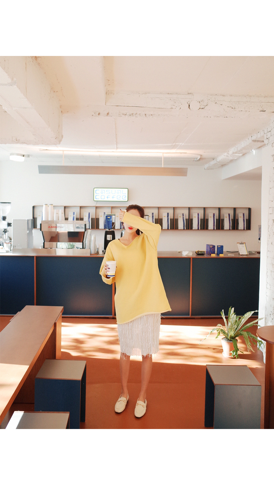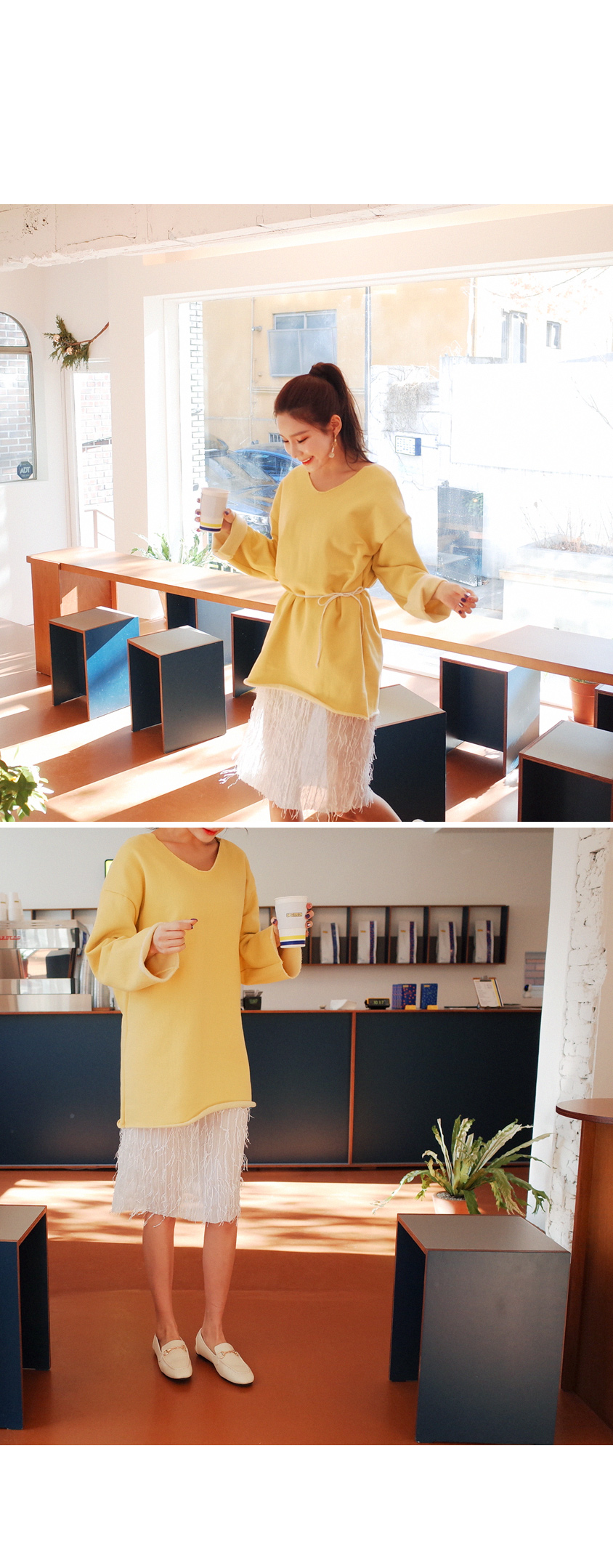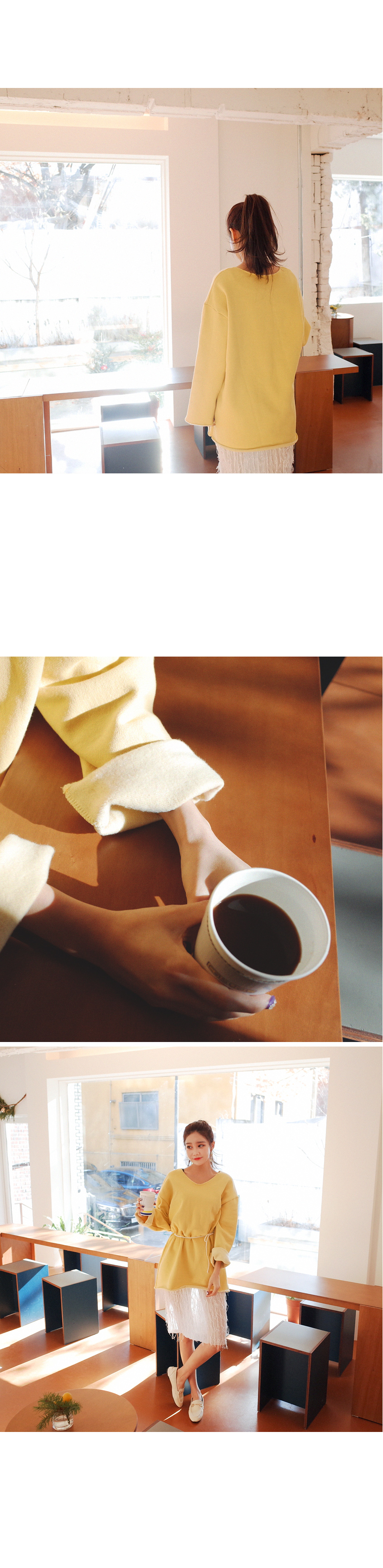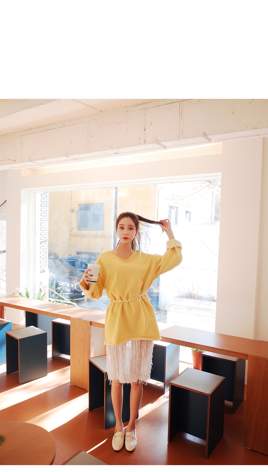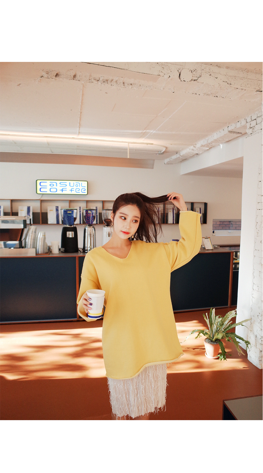 롱하게 떨어지는 길이감으로 힙까지 내려오는 데일리핏입니다