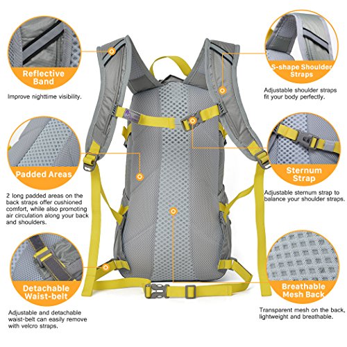 -. Feature : MATERIAL- Polyester ,Water-resistant Polyester as the fabric do not allow water to easily penetrate. / CAPACITY- 15L (915 cube inches).Hydration bcakpack for cycling, hiking, running, biking, climbing etc. Lightweight and breathable pack perfect for your bicycle or day-hike adventures. / HYDRATION SYSTEM COMPATIBLE- Internal hydration bladder's compartment and on the top for the water tube outlet . Big engugh for 2 liters hydration bladder. (Hydration bladder not included). / BEARING SYSTEM- 2 long Padded Areas on the back straps offer cushioned comfort, while also promoting air circulation along your back and shoulders. S-shape adjustable shoulder straps fit your body perfectly. / DETACHABLE WAIST-BELT- Adjustable and detachable waist-belt can easily remove with velcro straps