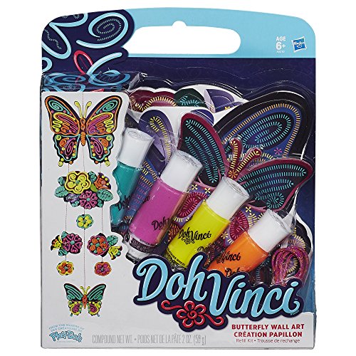 Let your DohVinci designs soar to new heights with your own amazing wall art! This refill kit comes with an 8-piece butterfly project and 4 Deco Pop colors for you to create awesome designs with bold 3D lines. String the pieces together any way you'd like to make this project truly your own, or follow the inspiration guide for tips and tricks. Grab your Styler (sold separately), then aim, squeeze and design! DohVinci, Play-Doh and all related properties are trademarks of Hasbro.Feature