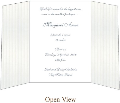 Studio : Storkie Express Publisher : Storkie Express Binding : Baby Product Product Description Birth Announcements: This beautiful Birth Announcement features a white card that is wrapped by a tri-fold vellum with faint, beige vertical stripes. It is elegantly fi 0