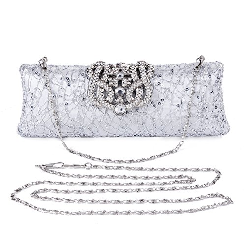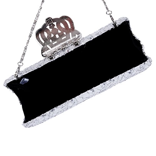 The clutch bag is fastened with a folded rhinestone adorned clasp on the top. This evening bag has detachable metal chain, so you can use it as a crossbody bag or just clutch it on your hand.
