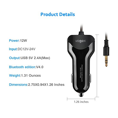 The Most Advanced Bluetooth Car Kit There are a lot of Aux adapters and chargers in the market, but most of them are using Bluetooth 3.0 with 2.1A power output. Vogek Bluetooth Aux Adapter is an upgraded version using Bluetooth 4.0 with 5v/2.4A SI power output. Not to mention its unbeatable price.