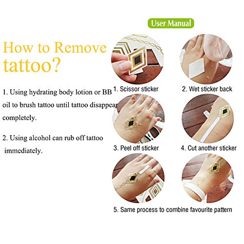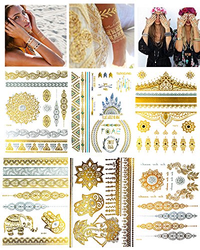 More than 50 patterns tattoos in gold, silver blue and a splash of black color, including boho-chic bracelets, armbands, elephant, lotus and arrows design. Small and large temporary tattoos to meet your different need. What you see in the beautiful photos is exactly what you'll get.