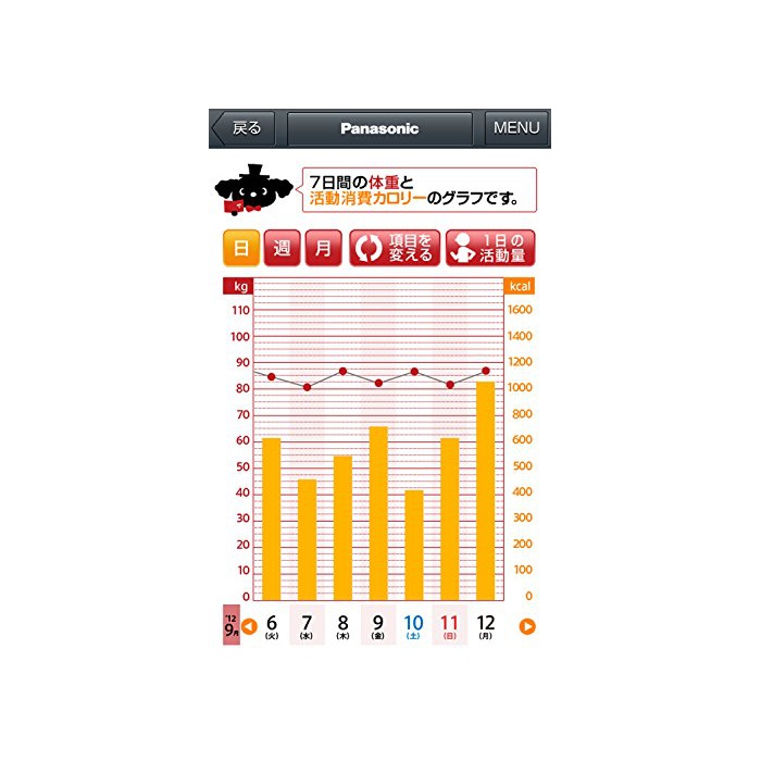 표시:체중/BMI/체지방율/피하 지방율/내장 지방 레벨/기초 대사/근육 레벨/골레벨/밸런스 연령/체조성 연령/과거 비교