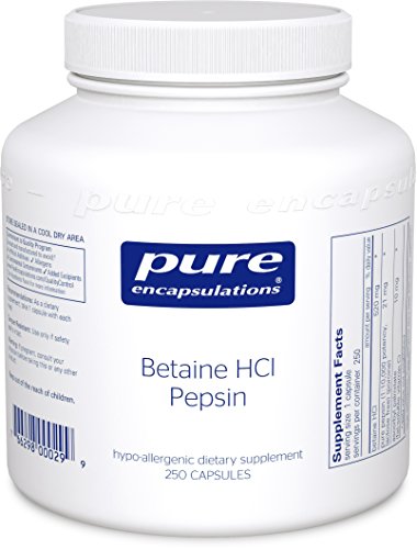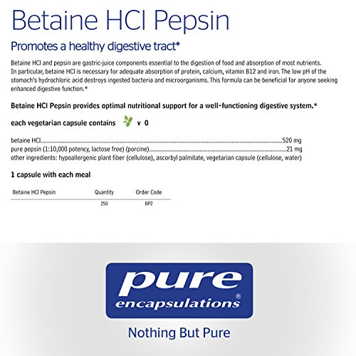 Betaine HCl and pepsin are gastric-juice components essential to the digestion of food and absorption of most nutrients. In particular, betaine HCl is necessary for adequate absorption of protein, calcium, vitamin B12 and iron. The low pH of the stomach's hydrochloric acid destroys ingested bacteria and microorganisms. This formula can be beneficial for anyone seeking enhanced digestive function.*