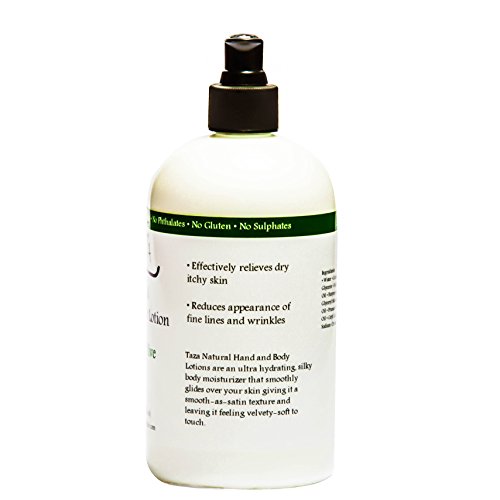 -. Feature : 99% Natural • No Parabens • No Phthalates • No Gluten • No Sulphates • Suitable for all skin types including the most sensitive / Contains Shea Butter, Coconut Oil, Almond Oil, and Sunflower Oil which forms a protective barrier over your skin to hold in moisture and effectively relieve dry itchy skin / This Hand & Body Lotion can offer some sun protection and support treatment of skin conditions like eczema, psoriasis, and skin inflammation for healthier looking skin / The Shea Butter, Coconut Oil, and Almond Oil ingredients assist the anti-aging process by boosting your skin's collagen production and reducing wrinkles, fine lines, and skin sagging for a younger looking appearance / Taza Natural Hand & Body Lotion and Taza Peppermint Dead Sea Salt Scrub are frequently purchased together