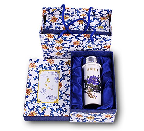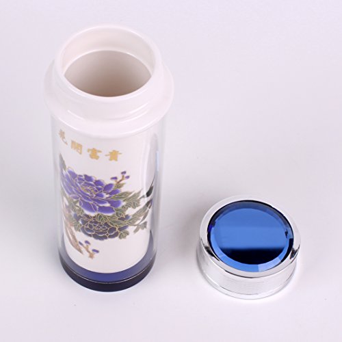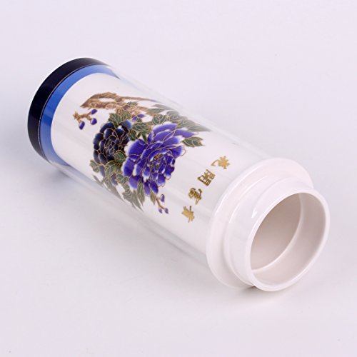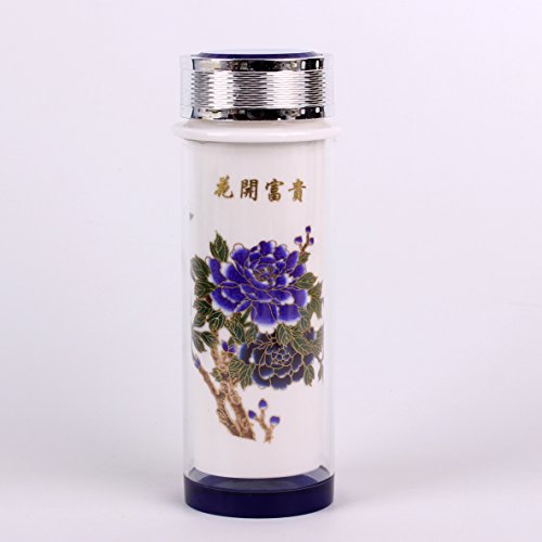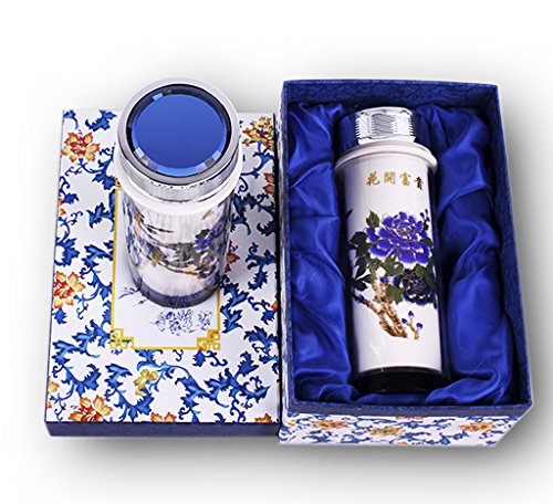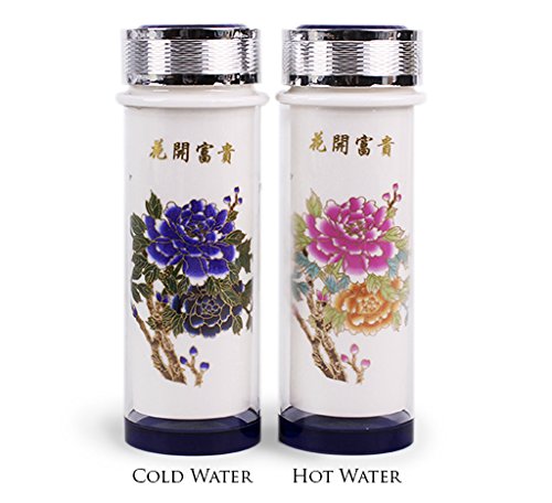 Beautiful color changing ceramic thermos with unique Asian inspired design. When hot water is poured inside the colors change from a bouquet of dark violet and blue to light orange and pink. When the water is cold the colors change back to dark. Gold leaf outlines the design and bring a new level of luxury to the thermos. The lid is silver with a blue jewel on the top giving it an elegant closure. It comes in a gift box lined in royal blue silk, which makes it perfect for a gift that looks more expensive than it is. Perfect for all occasions, this classy thermos is exactly what you need to sip your self slim with your Physique Tea.Feature