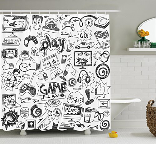 Video Games Shower Curtain Set by Ambesonne, Black and White Sketch Style Gaming Design Racing Monitor Device Gadget Teen 90's , Fabric Bathroom Decor with Hooks, 70 Inches, Blak White