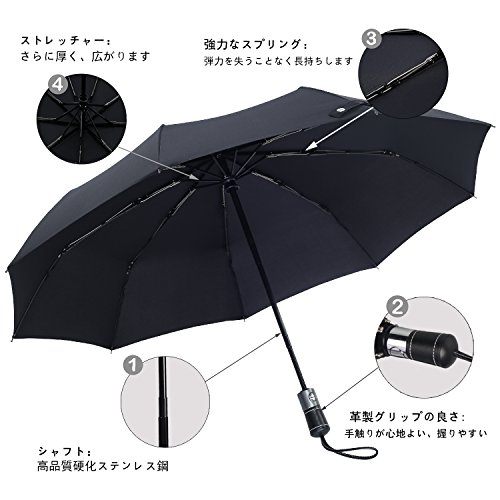 自動開閉:完全なオンオフシステムのため、ボタン一つで開閉できます。片手だけで、傘をすばやく開けたいときに非常に便利です。