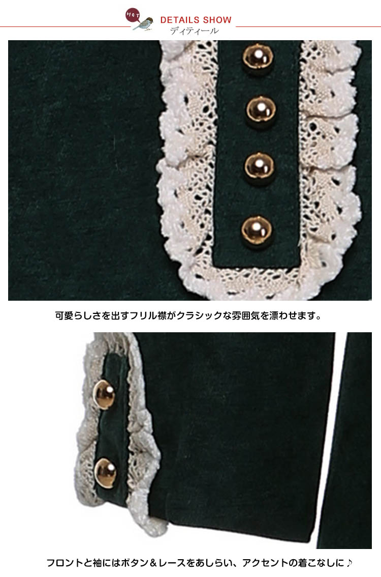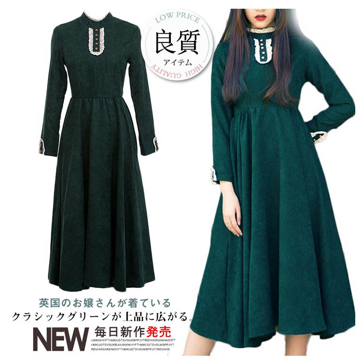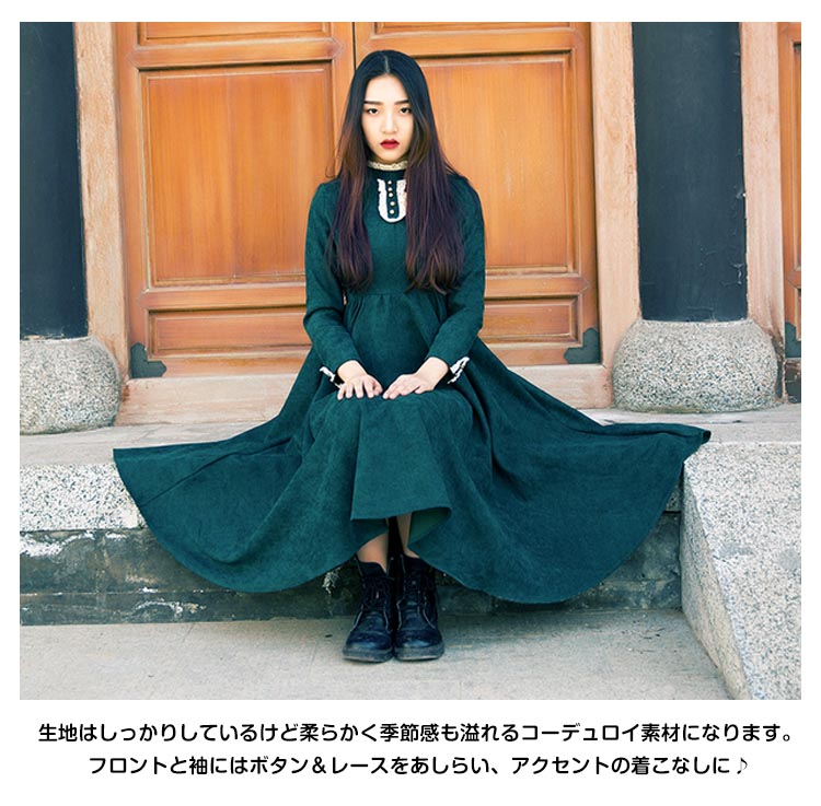 | 英国のお嬢さんが着ているクラシックグリーンが上品に広がる。ハイウエストで切り替えたふんわりフレアスカートが綺麗なロングワンピース!生地はしっかりしているけど柔らかく季節感も溢れるコーデュロイ素材になります。フロントと袖にはボタン&レースをあしらい、アクセントの着こなしに♪可愛らしさを出すフリル襟がクラシックな雰囲気を漂わせます。他にはありそうでなかった可愛らしいロングワンピースを、ぜひお試しください。 | |